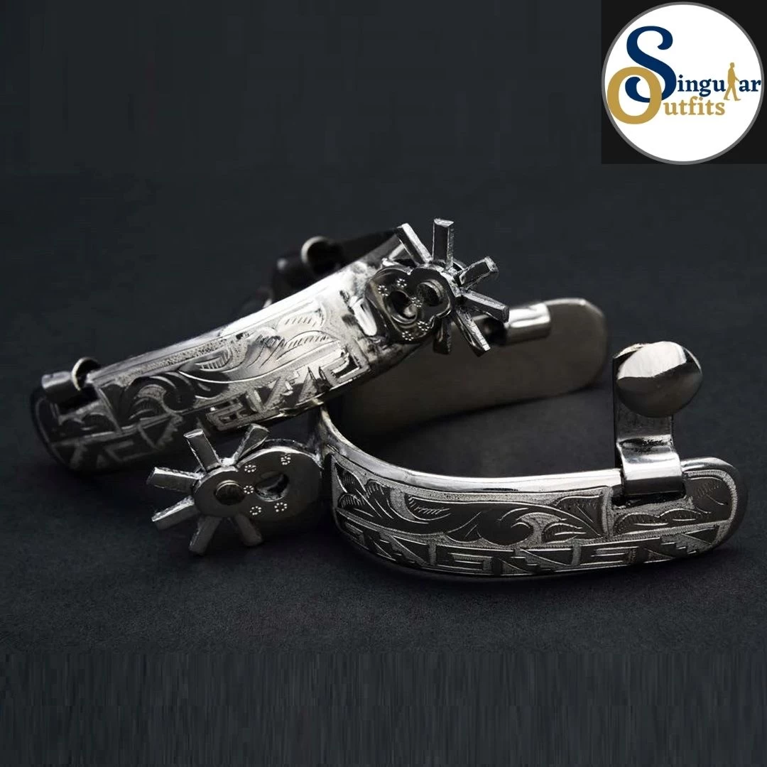 Charro Spurs made in Stainless Steel with Embossed. Traditional Mexican Spurs with fine engraved for Charros. Handmade in Mexico.