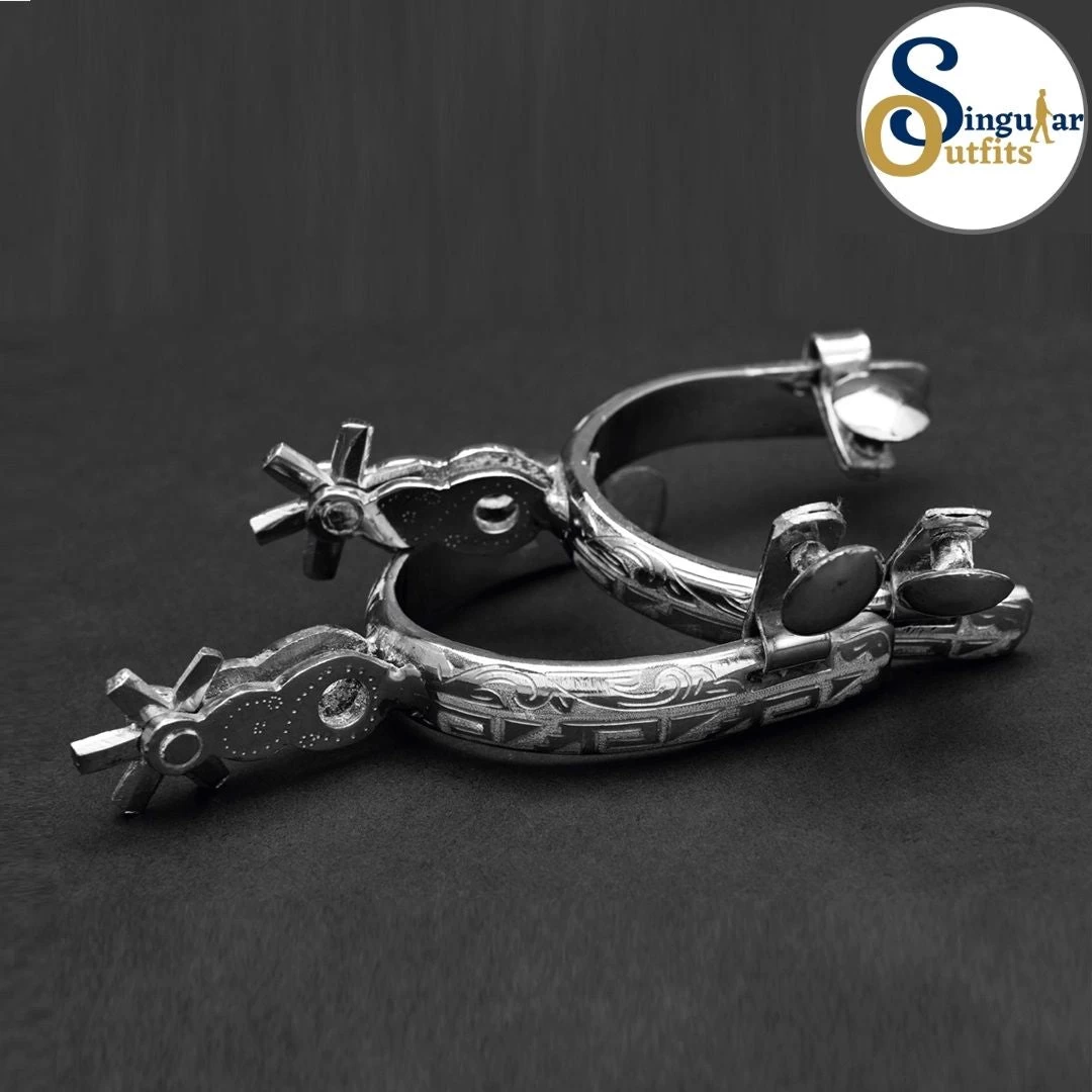Charro Spurs made in Stainless Steel with Embossed. Traditional Mexican Spurs with fine engraved for Charros. Handmade in Mexico.