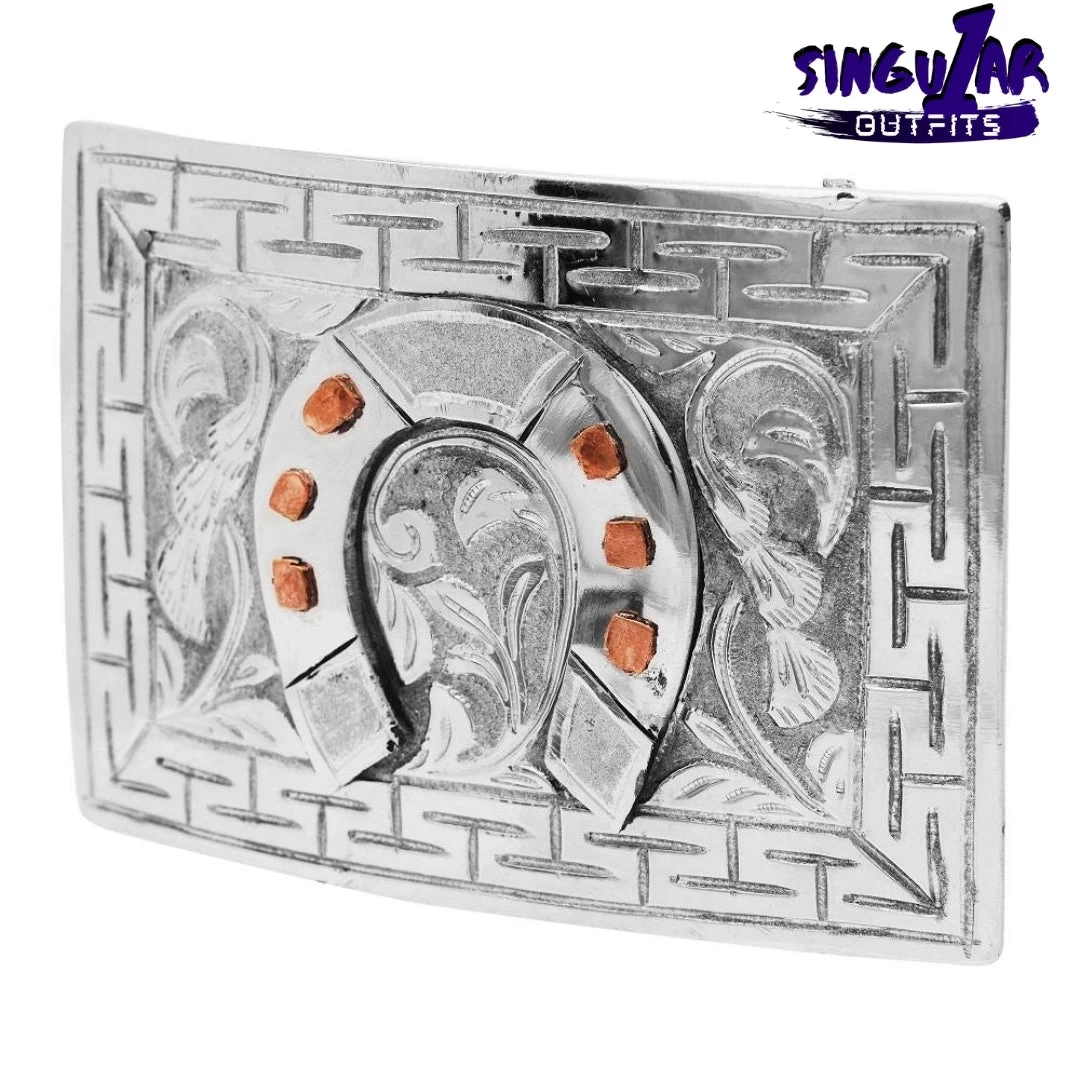 Hebilla vaquera fina tradicionales de acero inoxidable, grabada. Esta hebilla funciona con ropa casual, vaquera y charra, tanto para hombre como para mujer. Hecho a mano en Mexico.Â