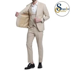 Men’s three-piece suit. This three-piece formal suit for men is perfect for any special event you need to dress elegant for or any business meeting. The 3-piece business suit is an outfit that includes dress pants, a formal vest, and a formal jacket.