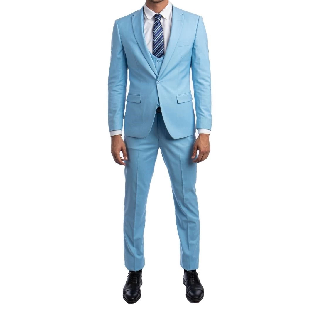 Men’s three-piece suit. This three-piece formal suit for men is perfect for any special event you need to dress elegant for or any business meeting. The 3-piece business suit is an outfit that includes dress pants, a formal vest, and a formal jacket.